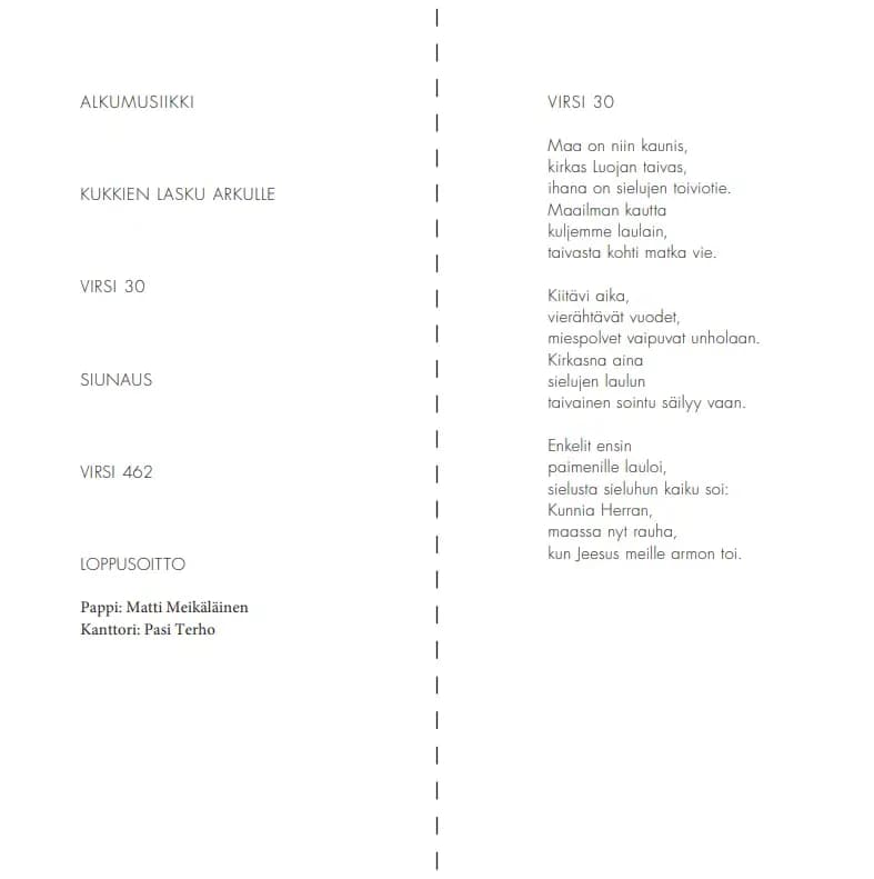 Sisältää: Ammatti graafikon vedokset kunnes omainen tyytyväinen, painatus 0–50 kpl, painatus premium valkoiseen kovakantiseen kartonkiin, käsiohjelmien valmiiksi taittelu, toimittaminen siunaustilaisuuteen n. 1h ennen tilaisuuden alkua, ja matkakulut pääkaupunkiseudulla.