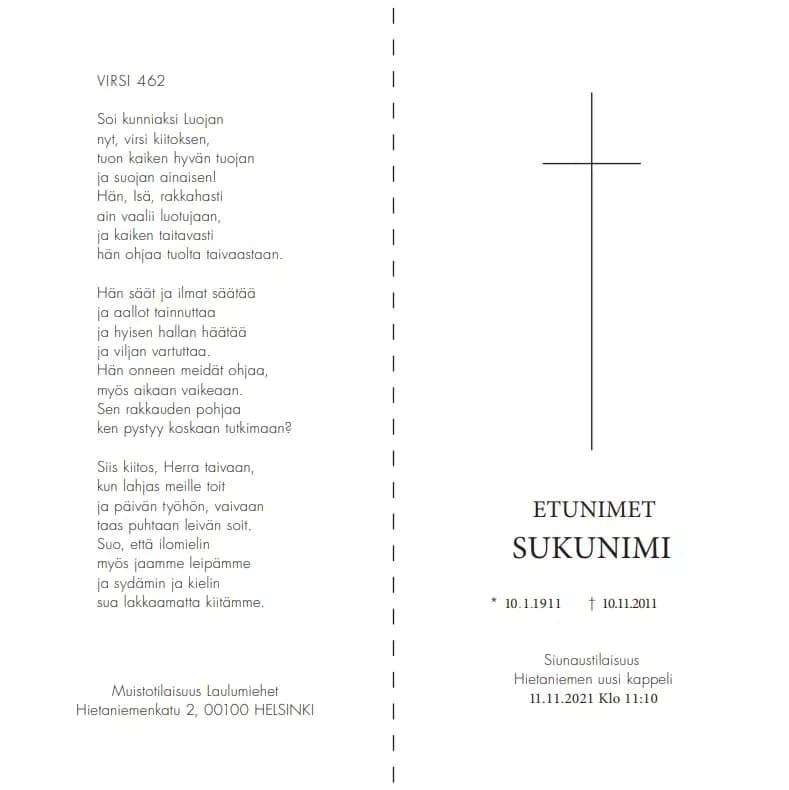 Sisältää: Ammatti graafikon vedokset kunnes omainen tyytyväinen, painatus 0–50 kpl, painatus premium valkoiseen kovakantiseen kartonkiin, käsiohjelmien valmiiksi taittelu, toimittaminen siunaustilaisuuteen n. 1h ennen tilaisuuden alkua, ja matkakulut pääkaupunkiseudulla.